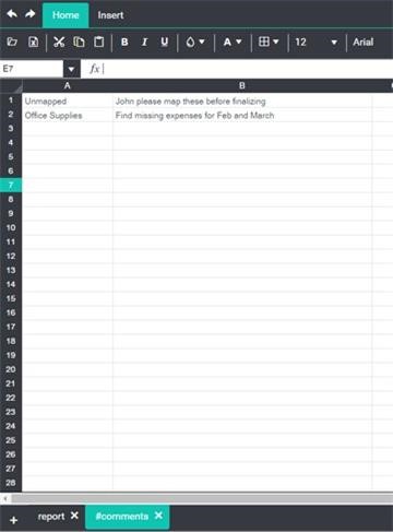 As an example, let’s say we want to add comments for accounts in a dynamic report (i.e. a report wherein the accounts are not named in the template but depend upon on the synced accounts). This can be done by creating a non-printing comments sheet named “#comments” with a table of account names and comments. Then use VLOOKUP in the printing report to find comments included in the final PDF.