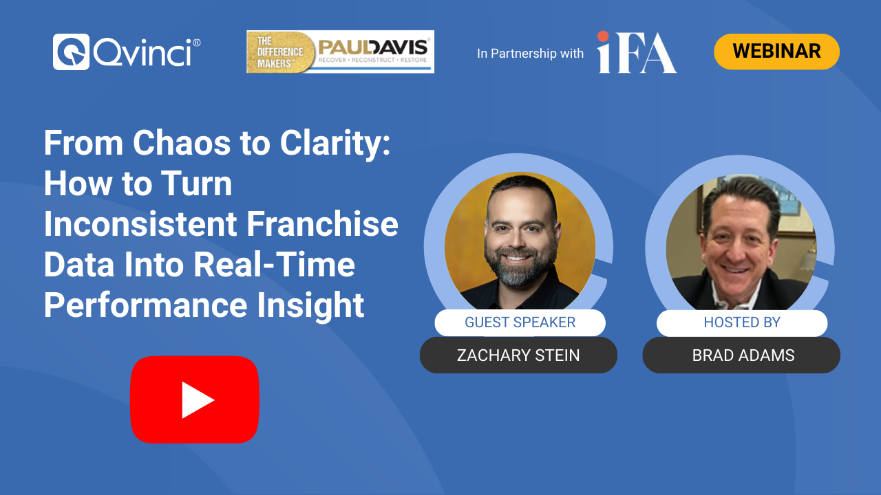 In this on-demand IFA webinar, “From Chaos to Clarity: How To Turn Inconsistent Franchise Data Into Real-Time Performance Insight,” Brad Adams (President & CEO of Qvinci) joins Zachary Stein (Financial Analyst at Paul Davis Restoration) to explain how elite franchise brands build a true data foundation before layering on dashboards, KPIs, or BI tools.