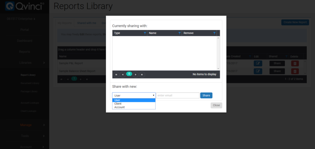 The new interface will allow you to click on the Share button and share a report, document or package with a specific user. With the old UI, sharing was only possible with all users in a Client Company or all users in the entire account.