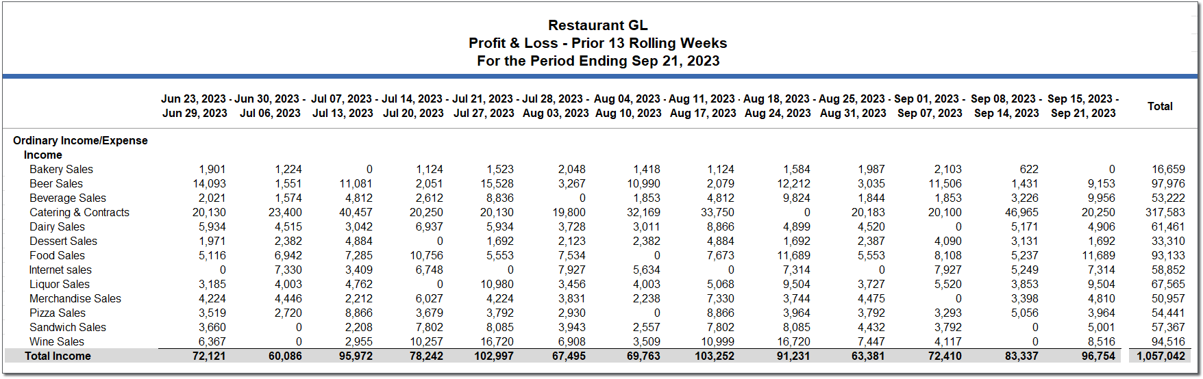 - Even report by week per period, quarter, or year. For instance, you can run reports over the last 13 weeks, by week, if that suits your needs.