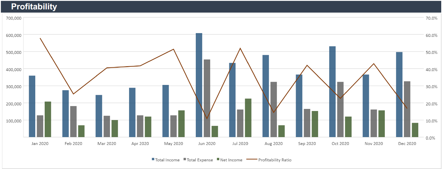 - Finally, there is a 12 month What If to Actual presentation with integrated charts and graphs