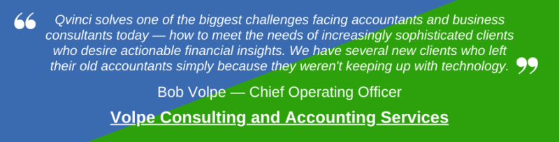 In today’s world, technology advances daily, and those professionals and organizational decision-makers who don’t keep up with it are oftentimes left wondering why they’re losing clients or falling behind their competitors. When it comes to innovation in financial reporting and business intelligence, the easiest way to stay ahead of the curve is to partner with Qvinci, which is what Volpe Consulting and Accounting Services did.